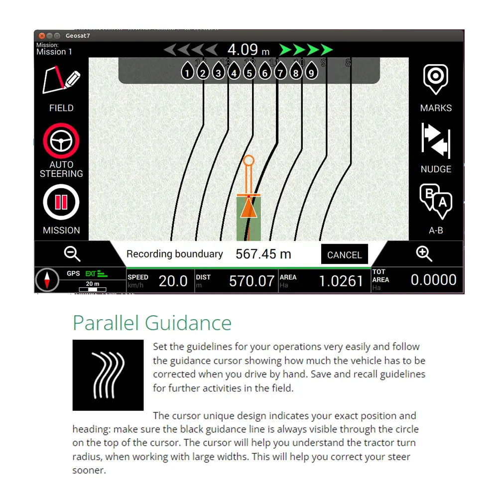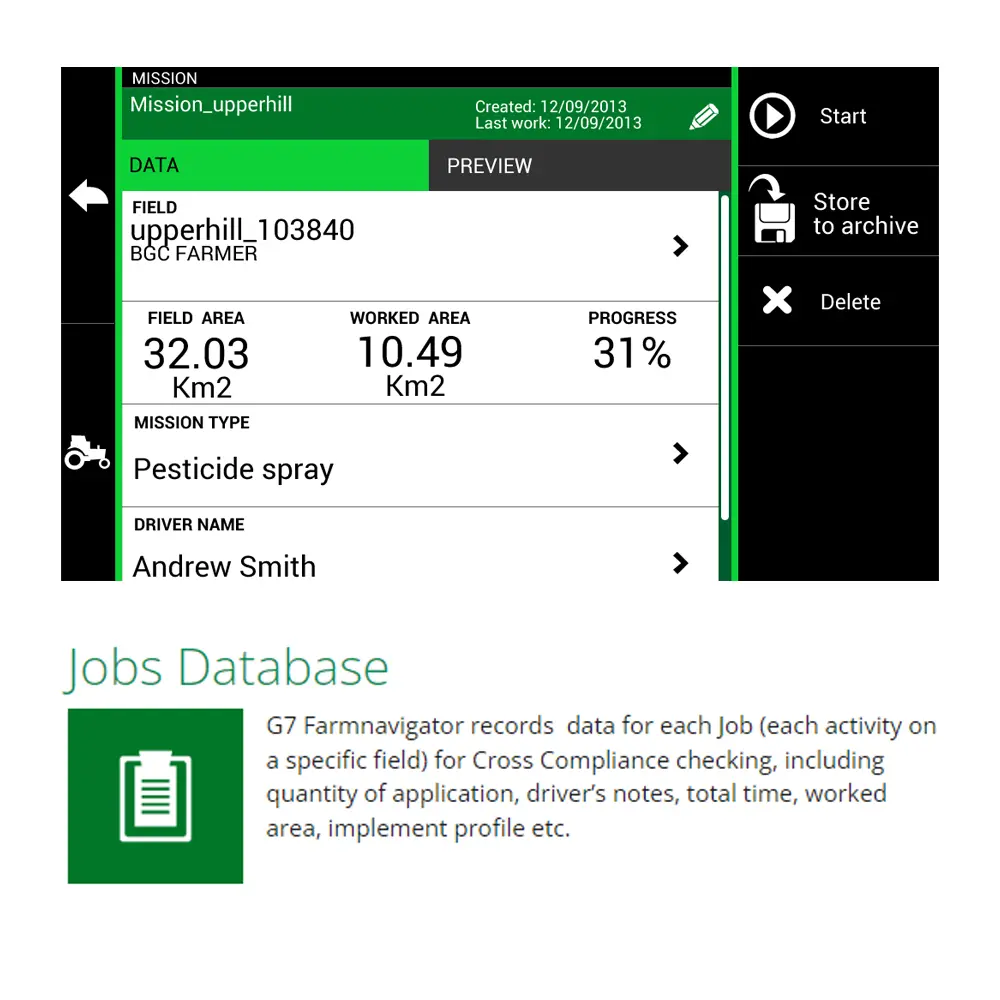 GPS navigacija G7 Farmnavigator je inovativna poljoprivredna navigacija dizajnirana za preciznu obradu poljoprivrednog zemljišta. Omogućuje satelitsko navođenje u polju i precizniju obradu usjeva. Koristan je za sjetvu, prskanje i prihranu. Ima najsvjetliji 7-inčni zaslon na tržištu, dobro vidljiv čak i pri jakom svjetlu, s nevjerojatno visokom rezolucijom i 16 milijuna boja. Zalijepljeni LCD zaslon ima premaz protiv odsjaja, izvanredan kontrast, poboljšanu otpornost na vibracije i zaštitu od magle.